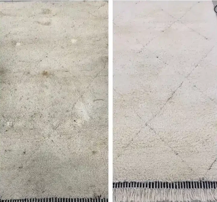 Le tapis est d’abord aspiré en profondeur, puis nettoyé avec un produit adapté à sa matière.